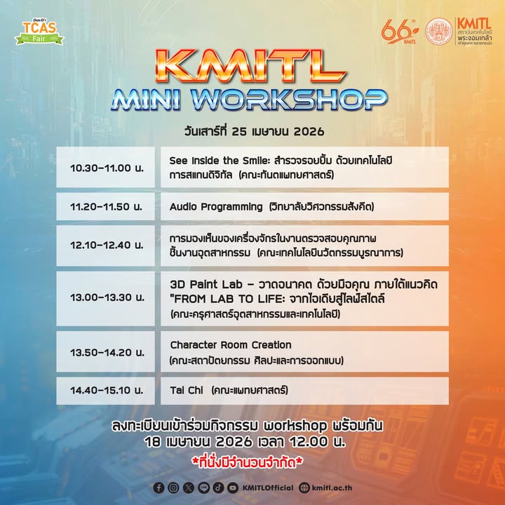 📢 ประกาศรายชื่อผู้ผ่านการคัดเลือกTCAS รอบที่ 2 (แบบโควตา) วิทยาลัยวิศวกรรมสังคีต 🎓 สาขาวิศวกรรมดนตรีและสื่อประสม 🎨 สาขาเทคโนโลยีและศิลปะสร้างสรรค์ ตรวจสอบรายชื่อได้ที่ 👉 https://www.reg.kmitl.ac.th/TCAS_old/news/files/2569_1_news1_4513_2026_04_24-13-33-24_eab19.pdf 📌 กำหนดการสำคัญ ✅ ยืนยันสิทธิ์ (Clearing House) ผ่านระบบของ ทปอ. 🗓 วันที่ 2 – 3 พฤษภาคม 2569 ✅ ประกาศรายชื่อผู้มีสิทธิ์เข้าศึกษา 🗓 วันที่ 8 พฤษภาคม 2569 ✅ ชำระเงินค่ายืนยันสิทธิ์ 🗓 วันที่ 12 – 19 พฤษภาคม 2569 ✨ ขอแสดงความยินดีกับน้อง ๆ ทุกคนที่ผ่านการคัดเลือก และขอเป็นกำลังใจให้ทุกก้าวต่อจากนี้ 💬 “ความพยายามของคุณในวันนี้ คือความสำเร็จของคุณในวันข้างหน้า”
